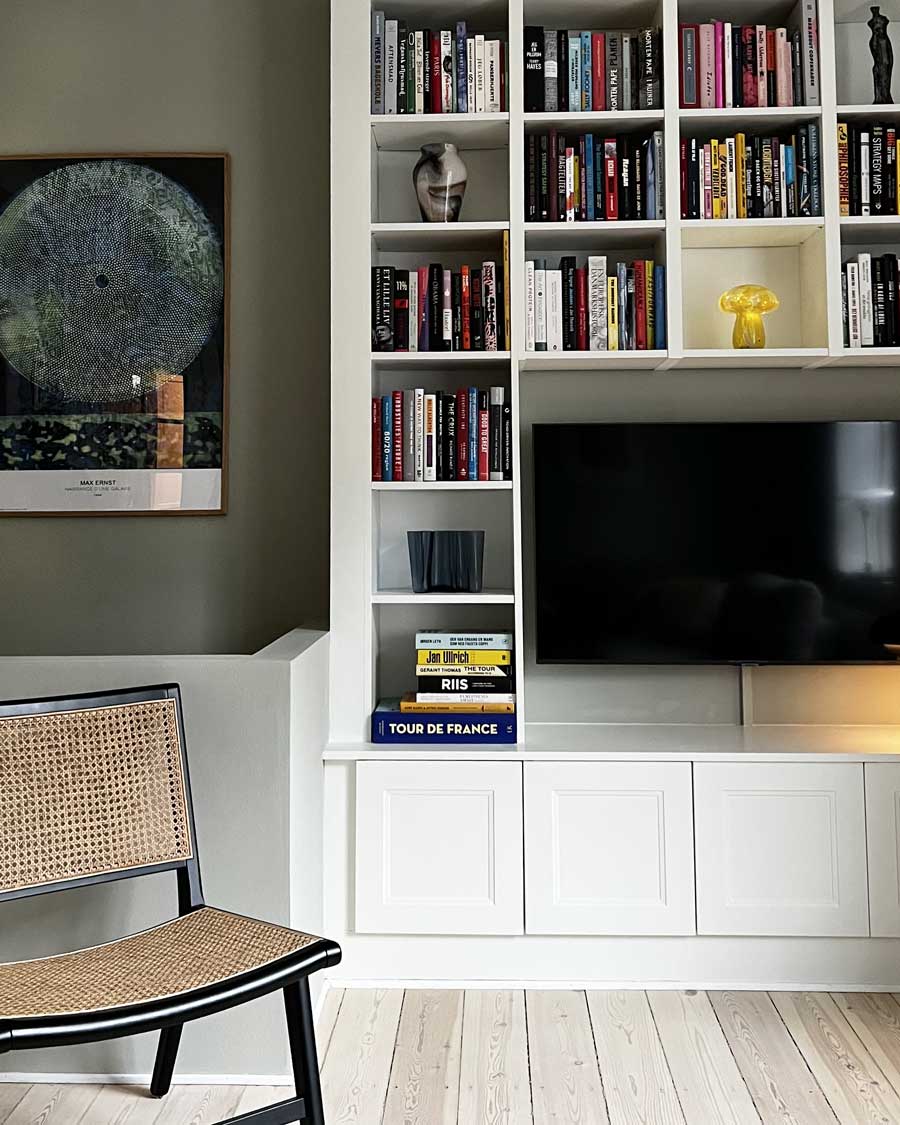 En indbygget reol er ideel til opbevaring af bøger, kunst, lamper osv. og med et hygge, æstetik og praktik for øje, er det med til at give rummet et helt nye look.